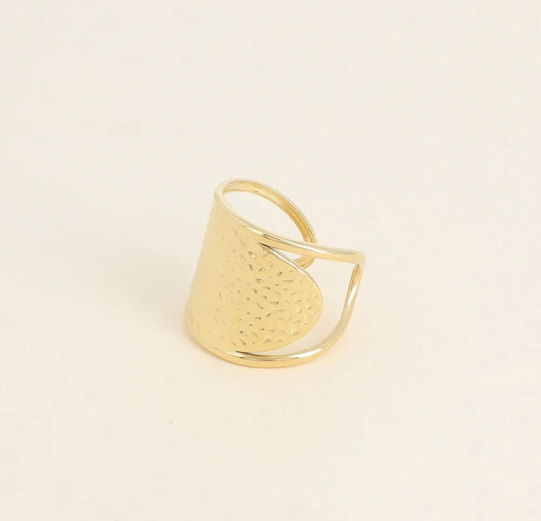 La bague Sofia est en acier inoxydable composée d'un double anneau et d'une forme ovale martelée.