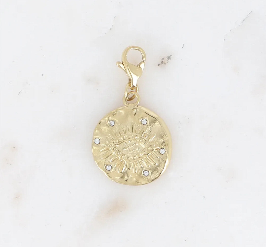 Le charm IRIS est en acier inoxydable composé d'une pampille ronde avec un oeil dessiné et embelli par des petits oxydes de zirconium.