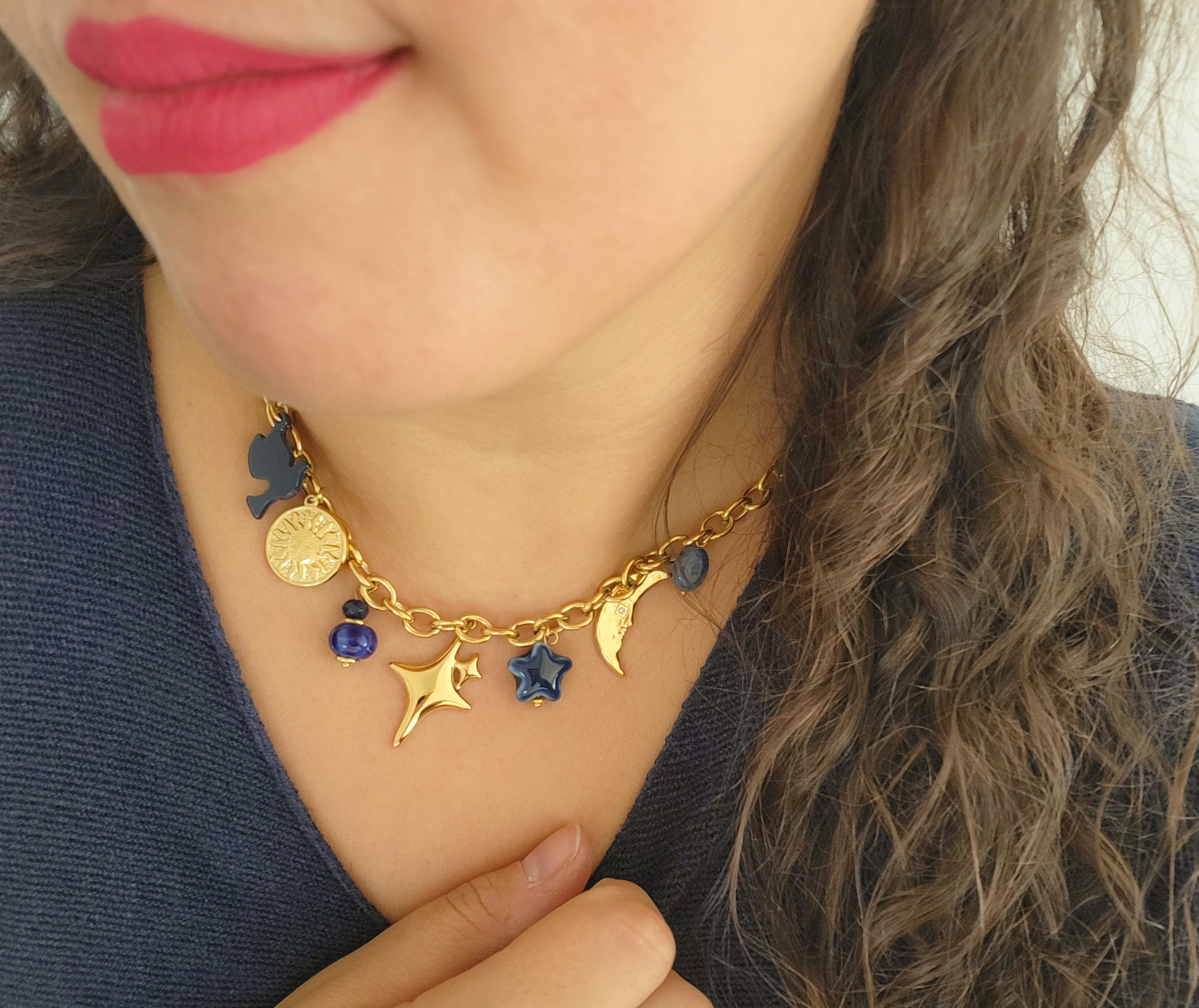 Le collier AGATHE est un collier sur chaîne en acier inoxydable composé de divers pendentifs (soleil, perles, lune, étoile et trèfle).