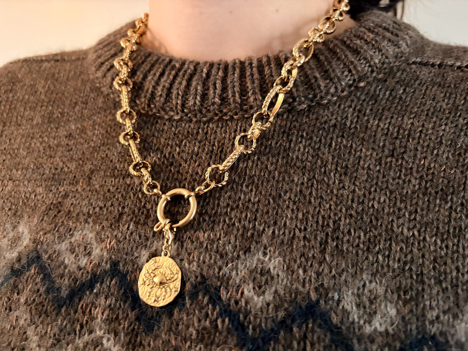 Ce collier est un locker uniquement avec le mousqueton central. Les charms ne peuvent pas s'accrocher sur les mailles. Certains peuvent toutefois s'attacher sur les 2 maillons proche du mousqueton central.