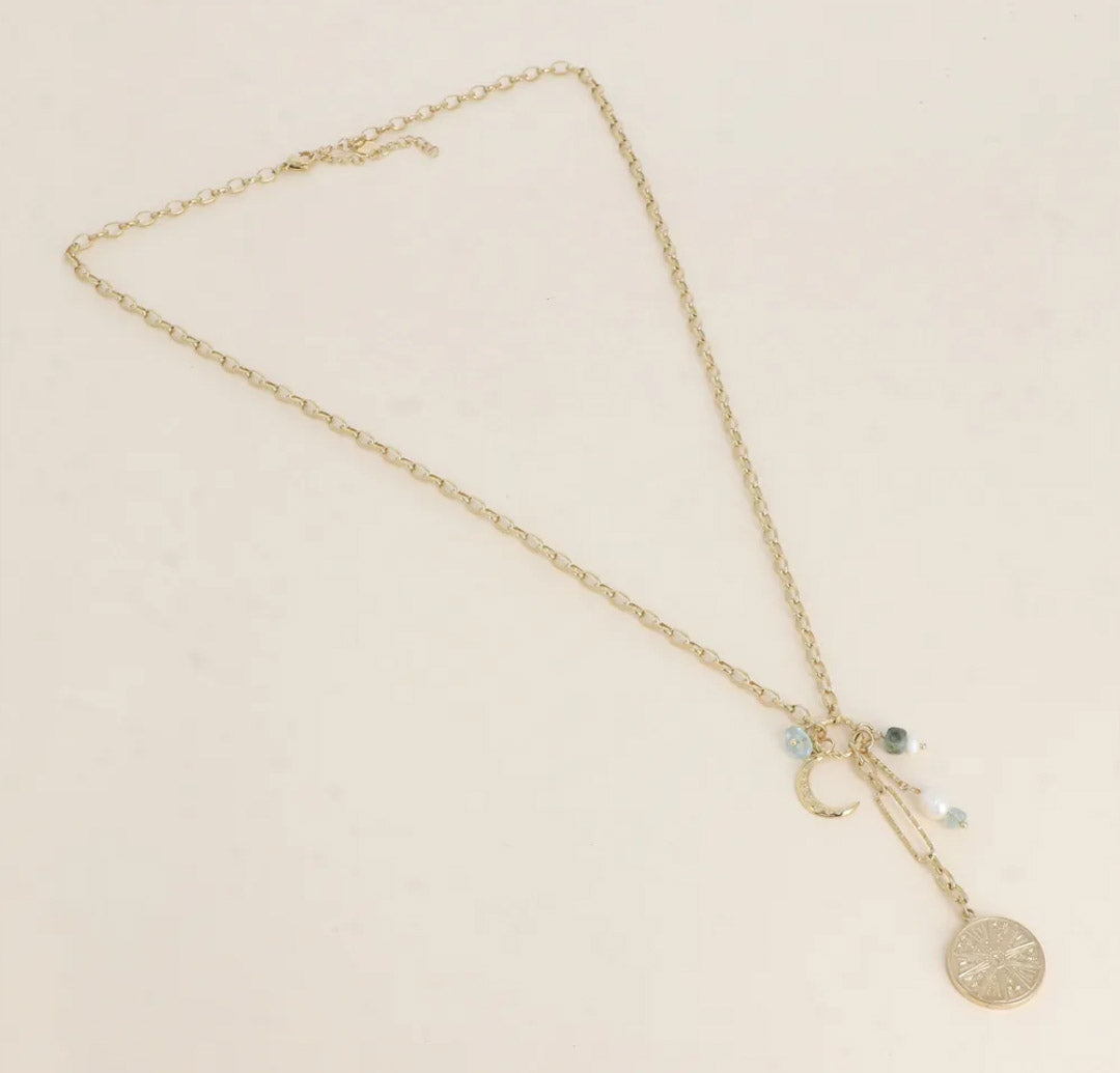 Le sautoir MELINDA est composé d'une lune, d'une médaille, et d"une perle d'eau douce et d'une turquoise africaine.